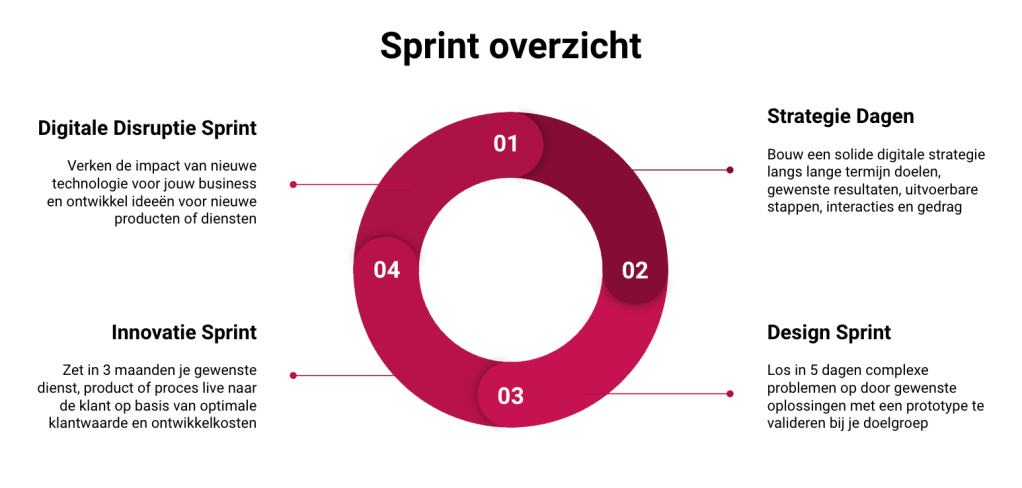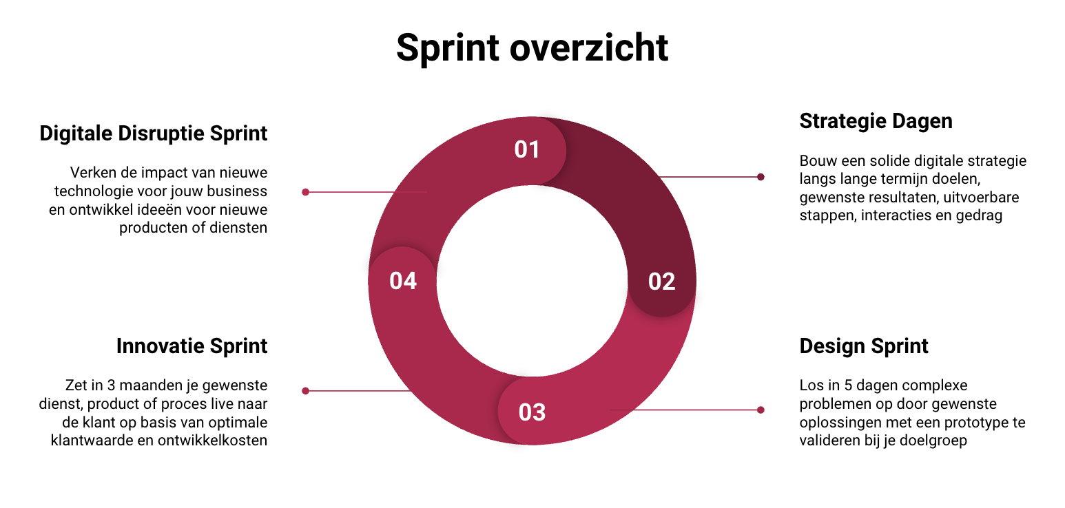 Het goed besturen van de business staat bij organisaties veelal op gespannen voet met succesvol vernieuwen en innoveren. Onze agenda’s zijn dagelijks volgepland met meetings en onze inbox vult de rest van de dag. Voor vernieuwing en innovatie is naast tijd in onze agenda ook ‘mentale tijd’ noodzakelijk. Sprints leveren gegarandeerd resultaat door volgens een beproefde aanpak, tijdgebonden met gerichte aandacht werk te doen.